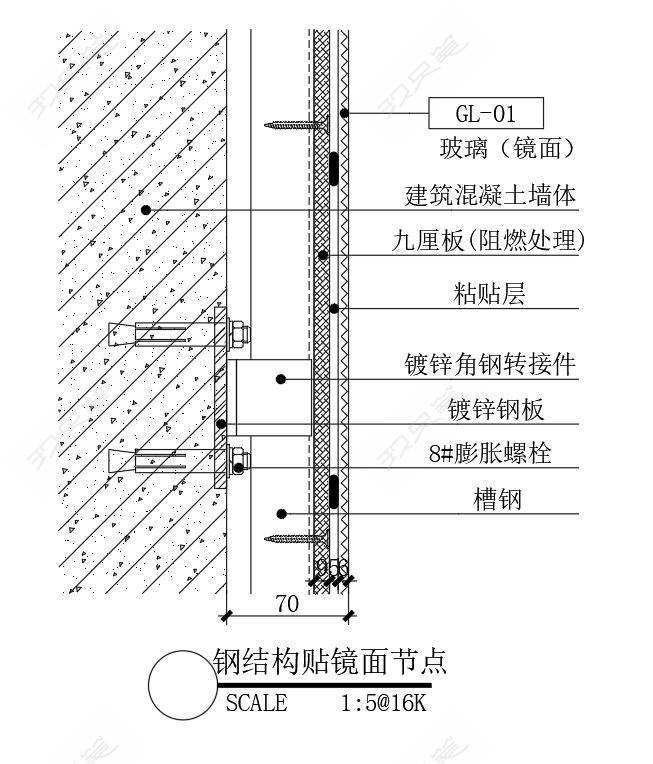 • 钢骨架木基层粘贴玻璃(镜面节点)
